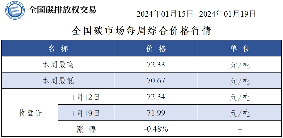 全国碳市场每周综合价格行情及成交信息20240115-20240119发表时间:2024-01-19 17:01