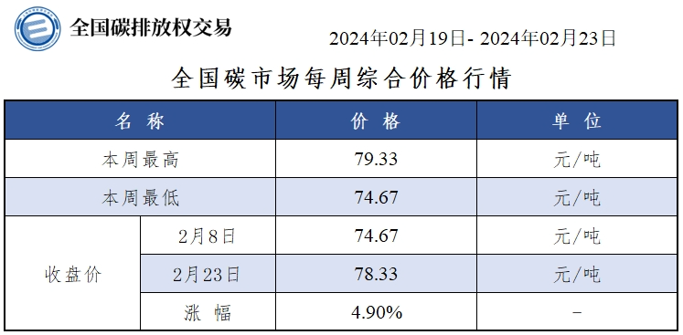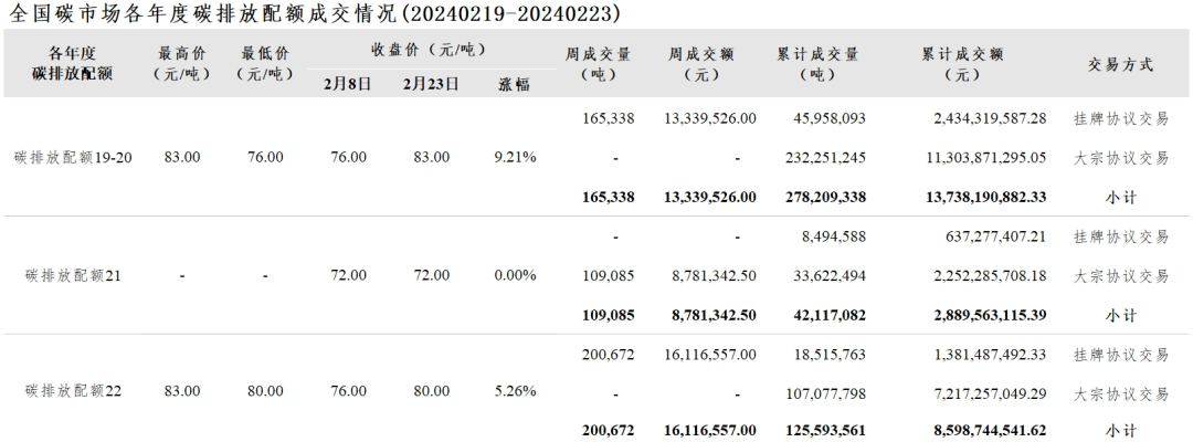 全国碳市场每周综合价格行情及成交信息20240219-20240223发表时间:2024-02-23 16:44