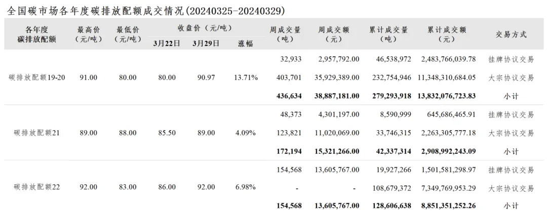 全国碳市场每周综合价格行情及成交信息20240325-20240329发表时间:2024-03-29 17:07