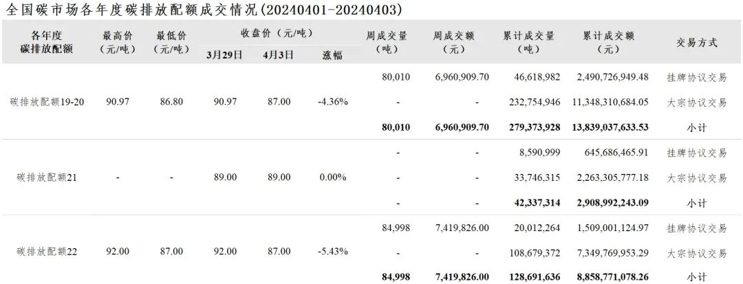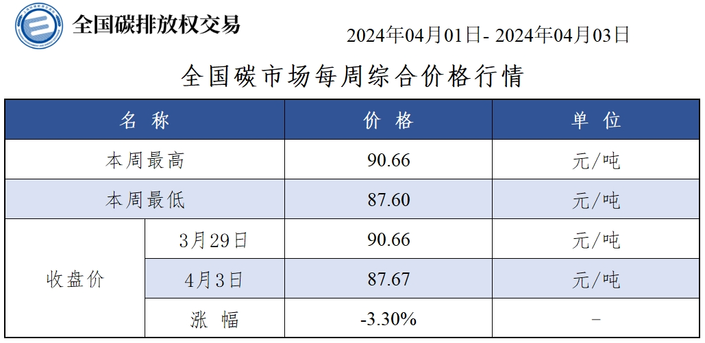 全国碳市场每周综合价格行情及成交信息20240401-20240403发表时间:2024-04-03 16:04